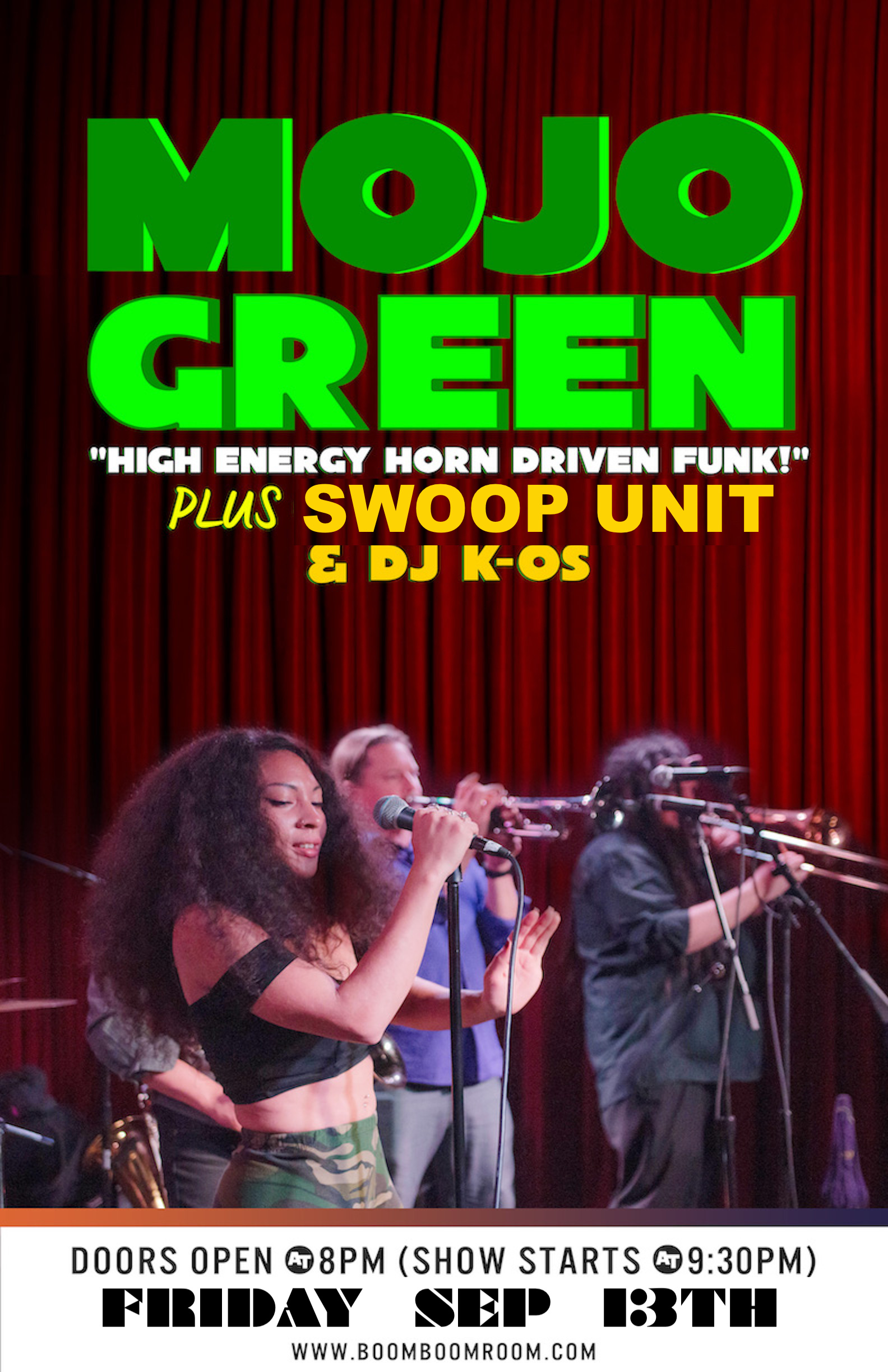 MOJO GREEN (+ SWOOP UNIT) Buy Tickets MOJO GREEN (+ SWOOP UNIT) & DJ K-OS Date:Fri Sep 13 Time:9:20 PM Age:21+ Price: Talent: When: Friday, September 13th, 2019 9:00 PM ’til 3:00 AM Door Time: 8:00 PM Show Type: High Energy Horn Driven Funk Restrictions: 21 & over ** MOJO GREEN ** (High Energy Horn Driven Soul Funk) plus: * SWOOP UNIT * and: * DJ K-OS * MOJO GREEN (High Energy Horn Driven Soul Funk)7-piece, female-fronted, horn-heavy funk and Soul band from Reno, NV. High energy, hard hitting dance music. …has recently supported Lyrics Born, Karl Denson‘s Tiny Universe, Lettuce, The Funky Meters, The Motet, Trombone Shorty, Orgone, The Pimps Of Joytime, Dumpstaphunk, Galactic, The New Mastersounds, Big Sam’s Funky Nation, ALO, Turkuaz, The Monophonics, Rusted Root and has earned them the reputation of being one of the funkiest high energy live shows on the West Coast. Their shows have been lighting up audiences… The Great American Music Hall, The Independent, The Chapel, The Boom Boom Room, The Viper Room, The Armory, Sweetwater Music Hall, The Mint, The Mateel Music Fest, TreeFort Fest,Hangtown Halloween Ball, For The Funk Of It, Squaw Valley Funk Fest, 4 Peaks Music Festival,The Bounce Music Festival,Redwood Mountain Faire, Ridgestock Music Festival, Burning Man, Guitarfish, Enchanted Forest Gathering, Off Beat Music Fest, Spookadelic Halloween Funktacular, Hard Rock Hotel And Casino Lake Tahoe’s Grand Opening, Sandpoint Summerfest, Concerts At Commons Beach,Live at Lake View Tahoe. “This band brings so much Soul to every show they play! High Energy Non Stop Dance Party!” (Great American Music Hall)“We loved hosting them- and the audience loved them too.” – Justin Crellin (Mateel Summer Arts & Music Fest) “Mojo Green delivered the goods. I had so many people tell me how much they loved their set.” – Jason Gallagher (Spookadelic Funktaculuar @ Ashland Armory) “Yeah man, crowd loved them! Super great vibe.” – Brian Richards (Mountain Town Music Series- Park City) “Awesome show and Mojo killed it! They are a great band.” – John Edwards (Sandpoint Summerfest) plus: * SWOOP UNIT * Groove and Original Dancefloor Jazz Funk. 8 seasoned musicians compile this group of soul survivors. Swoop Unit is one of the hardest working, greasy-pocketed, groove-ladened, funky soul jazz machines you will ever hear!! Boasting an all-star veteran cast of players, Swoop Unit members have all been instrumentally active in the Bay Area’s Funk, Soul, and Jazz scenes for the past 15-20 years. IN THE BEGINNING… Swoop Unit got its start with a weekly gig at Bruno’s back in the summer of 1999. At that point, the band consisted of bass, drums, organ and guitar. They were doing the Rare Groove sound and flirted with Acid Jazz. The arrangements,all instrumental, were a perfect match for the lounge culture of the day. But soon they wanted to take the concept to the next level, and invited horn players to sit in. While at Bruno’s, Swoop Unit added three great horn players to its sound. THESE DAYS… Swoop Unit’s focus over the past few years has been on developing up-tempo dance sets. Their original compositions are deeply rooted in boogaloo, soul-jazz and New Orleans funk, with a hint of Latin from time to time. Pretty much anything with a fat (I mean, phat) groove usually gets the party going wherever they play. With a group of seasoned players as is the Swoop Unit, this band is sure to please. Notorious for their hard work ethic and huge repertoire, Swoop Unit has been building a loyal following over the last several years and filling dance floors with sweaty bodies shakin’ it to the Funk. With the release of their original EP and bevy of other original material, Swoop Unit has proven that the Almighty Groove is in Mighty good hands. Rossana Schneider-Vocals Paul Rustigian-Keys Adam Willis-Drums Steve Neil-Bass Patrick Greene-Guitar Nathan Harris-Tenor/Bari Sax Scott Okamoto-Trombone John Gibson-Trumpet Lineup Media: