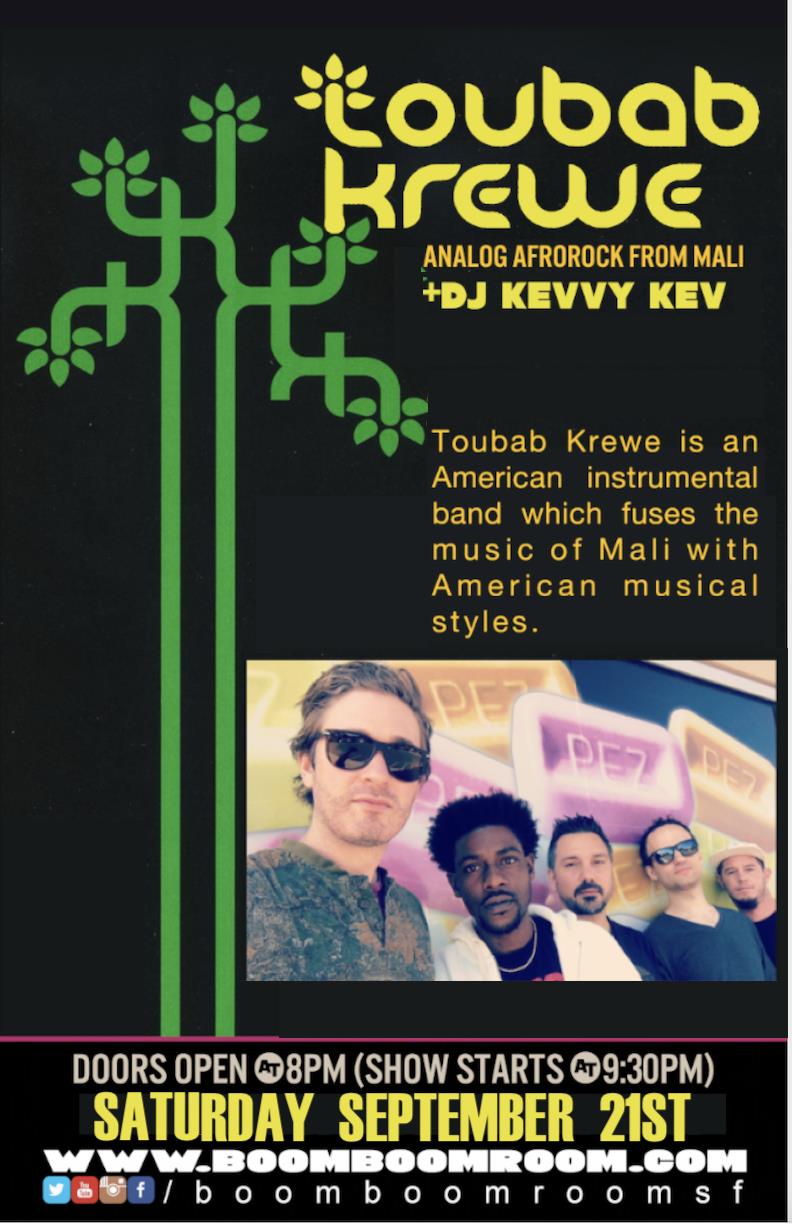 TOUBAB KREWE (& DJ Kevvy Kev) Buy Tickets TOUBAB KREWE + Orchestra Gold (& DJ Kevvy Kev) Date:Sat Sep 21 Time:9:30 PM Age:21+ Price: Talent: When: Saturday September 21st, 2019 9:15 PM ’til 3:00 AM Door Time: 8:00 PM Show Type: Funk, Psychedelic Soul, Afrobeat, Rock, West African Beats, Original Restrictions: 21 & over ** TOUBAB KREWE ** plus: * ORCHESTRA GOLD * and: * DJ KEVVY KEV * TOUBAB KREWE Toubab carries echoes of African greats like Ali Farka Toure, Orchestra Baobab and Salif Keita, no doubt picked up during the group’s travels to study and live in Guinea, Ivory Coast and Mali. But what truly differentiates Toubab Krewe from other Statesiders inspired by African music is how they innovate on what they’ve learned instead of simply recreating tradition. Toubab Krewe carves out a new trail honoring the African originators they admire by making something alive and contemporary. Some music cannot be found on a map or within iTunes categories. Some music is so original it seems snatched from the great, invisible substrata that runs below all human activity, a sound aching to be born without a flag or fixed allegiance – free, questing, overflowing with immediate, tangible life. This is the music of Toubab Krewe, the vibrant Asheville, NC-based instrumental powerhouse that creates a sonic Pangaea that lustily swirls together rock, African traditions, jam sensibilities, international folk strains and more. While nearly impossible to put into any box, it takes only a few moments to realize in a very palpable way that one is face-to-face with a true original who recognizes no borders in a march towards a muscular, original, globally switched-on sound. “a futuristic, psychedelic, neo-griot frenzy.” – Village Voice “a new standard for fusions of rock n’ roll and West African music.” – Afropop Worldwide “Their music avoids cliché with authentic extrapolations of traditional Manding beats, percussion, and jam-band flare.” – The New Yorker “…expertly meshed surf guitar with Malian rhythmic patterns, a Dick Dale moves-to-Timbuktu experiment in Afro-California fusion.” – Boston Herald “Toubab Krewe has such a visceral, ear-yanking quality that in the band’s capable hands you just might find your definitions of what is/is not rock n’ roll and worldbeat being completely rewritten. This is the sound of liberation.” – Blurt “one of the most innovative voices in music today.” – Honest Tune ORCHESTRA GOLD Fronted by the charismatic Malian singer and dancer Mariam Diakité, Orchestra Gold (OG) plays an original stew of African – inspired rock and soul music. Drawing deeply on Mali’s musical history, OG blends analog, rhythmic dance music together with elements of psychedelic soul. With roots Malian drumming and the deep wisdom of Mariam’s vocals, OG moves audiences from the inside out. http://orchestragold.com/ https://www.facebook.com/OrchestraGold/ PRESS: “Mali’s musical heritage is vast…and Mariam’s voice channels that history” — Banning Eyre, Senior Editor Afropop Worldwide “I am impressed at the delicate balance Mariam has struck between paying homage to the roots music of the ancestors, and looking to the future” – Stephen Kent, Producer Music of the World KPFA Radio “…the dynamo out front is Diakité, who has spent her life soaking up Malian traditions.” – Andrew Gilbert, Music Journalist “At a time when everything we do revolves around how technology will influence our future, it is refreshing to hear from musicians who want to preserve old sounds…and introduce them to a younger generation of music aficionados.” – Azucena Rasilla, East Bay Express VIDEO: 1) Orchestra Gold – Mali Senekelaw (LIVE) 2) Orchestra Gold – Mady Gundo 3) Orchestra Gold – The Story Lineup Media: